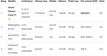 Après avoir tout testé, le grand gagnant 2025 toutes catégories est sans aucun doute le Home Fitness Code Y1 avec inclinaison automatique.À 239,99 € en ce moment (prix le plus bas jamais vu), tu as :