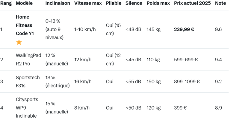 Meilleur tapis de marche inclinable 2025 : test complet du Home Fitness Code Y1 (239,99 € promo). Inclinaison auto 0-12 %, ultra-silencieux, pliable. Comparatif 8 modèles + avis réels.